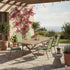 Das robuste Aluminiumgestell wird durch edle Nonwood-Teak Look-Elemente an den Armlehnen und der Tischbelattung ergänzt und sorgt für eine warme, zeitlose Optik. Der Tisch mit praktischem Synchronauszug lässt sich im Handumdrehen vergrößern – ideal, wenn spontan mehr Gäste dazukommen.